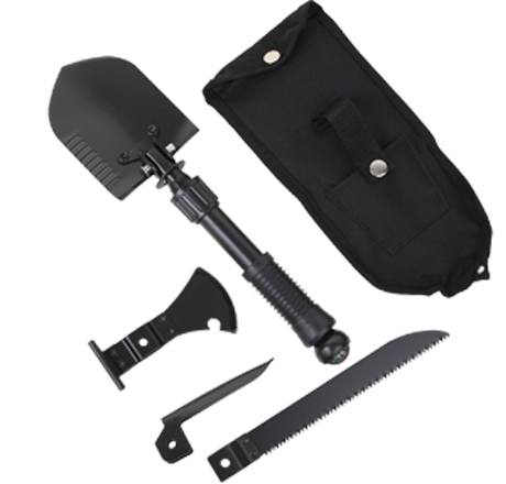 Made of heavy duty forged steel, this handy 5-in-1 Survival tool kit is ideal for use while camping, hiking, backpacking, fishing, hunting, gardening or any outside activity. Tools are interchangeable and securely mount on the handle which has a rubberized anti-skid grip. Tools include a shovel with scraper, axe/hammer, pick, saw, and a compass mounted on the end of the handle. Tools compactly fits in a nylon carry case with belt loop attachment. Case Size: Approx. 11"L by 5"W. Shovel w/ handle: Approx. 13"L by 3-3/4"W. Saw Blade - 7-1/2"L. Pick - 4"L